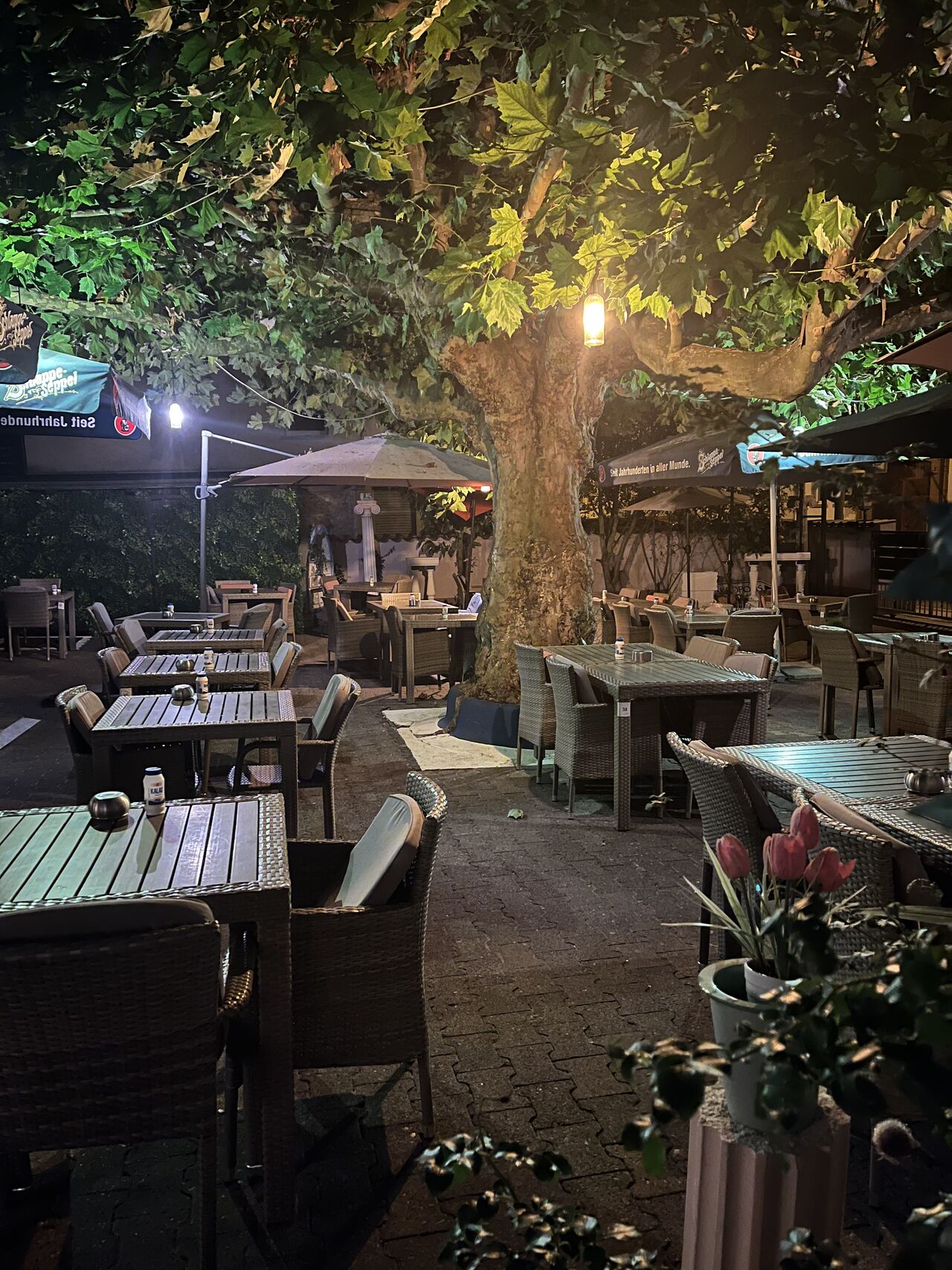 Ein ganz besonderer Ort erwartet Sie in den warmen Monaten: unser idyllischer Biergarten, der weit über die Grenzen Hanaus hinaus geschätzt wird. Im Zentrum steht eine majestätische Platane, deren ausladende Äste nicht nur Schatten, sondern auch eine einzigartige Atmosphäre schenken.